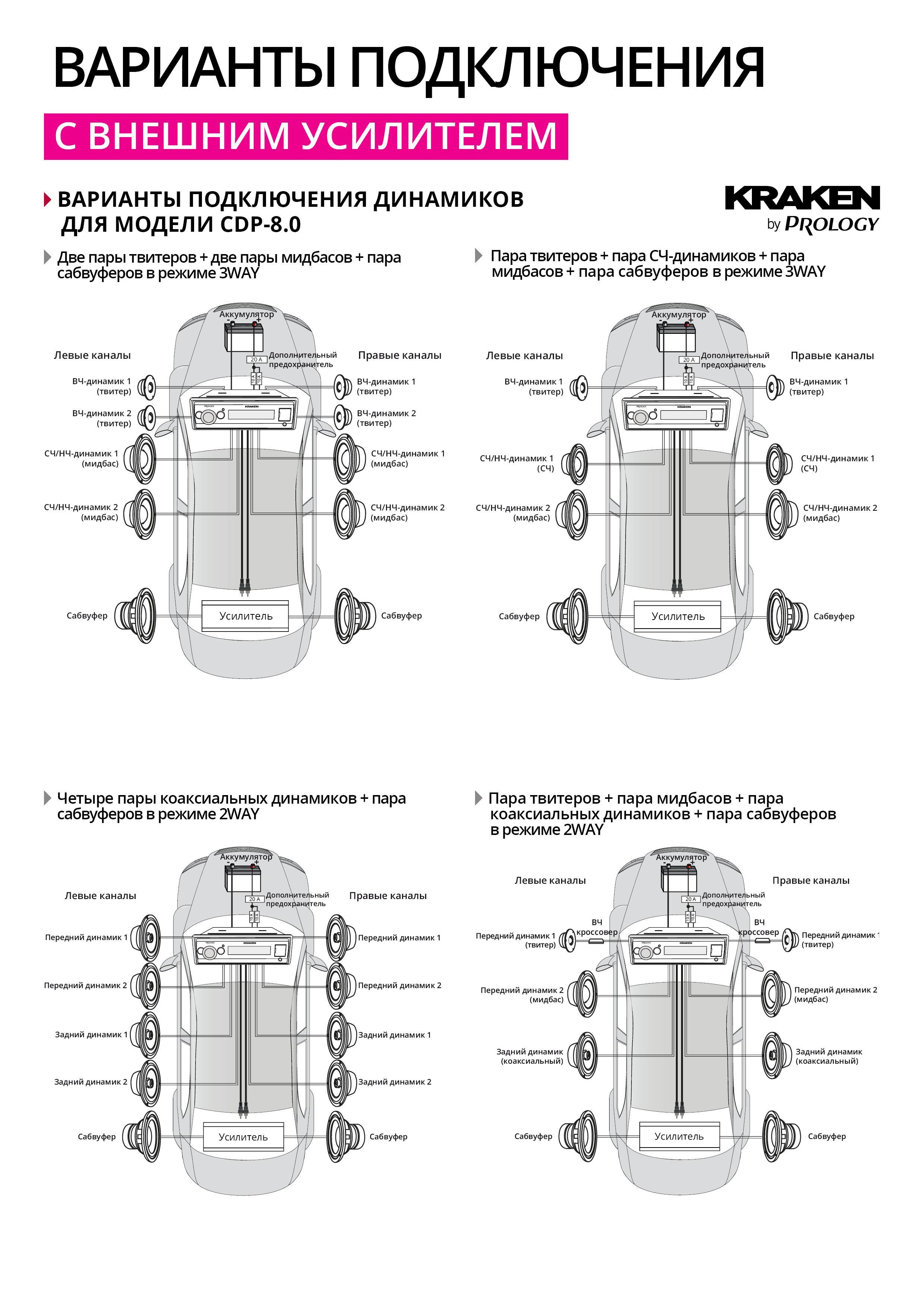 Схемы возможных подключений акустических систем и сабвуферов для магнитол KRAKEN серии CDP с DSP процессорами: Смотреть
