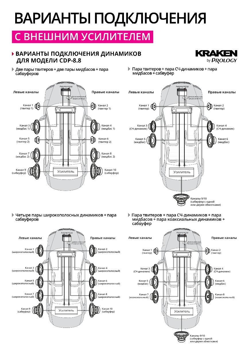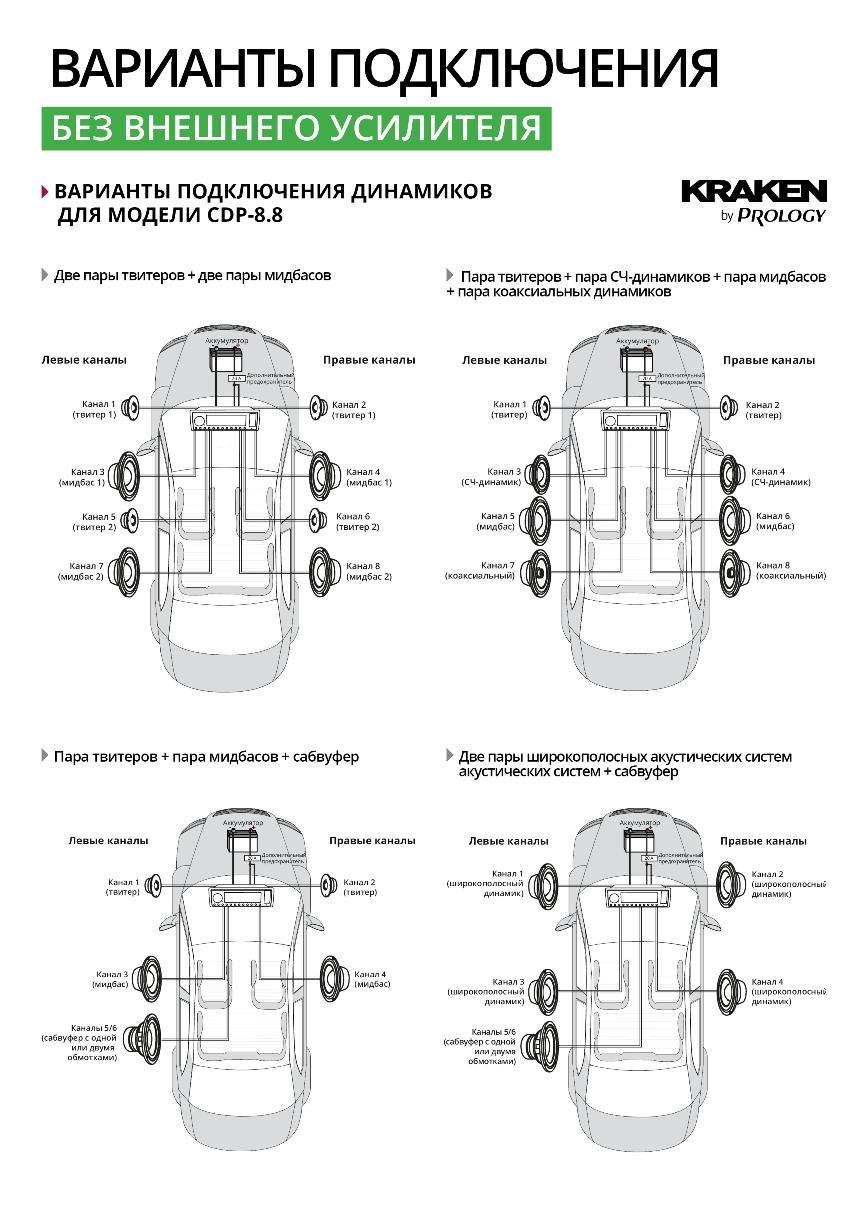 Схемы возможных подключений акустических систем и сабвуферов для магнитол KRAKEN серии CDP с DSP-процессорами: Смотреть