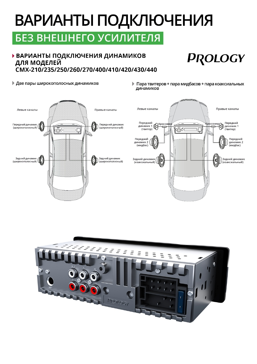 Автомагнитола PROLOGY CMX-400 предоставляет широкие возможности для построения в автомобиле развитой аудиосистемы. Для подключения дополнительных внешних усилителей предусмотрен 4-канальный линейный аудиовыход RCA, а также 2 выхода RCA для подключения сабвуфера.